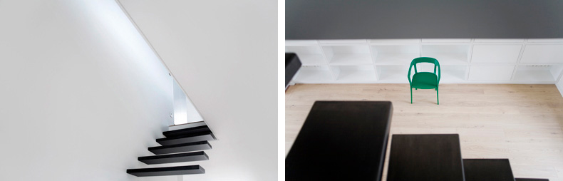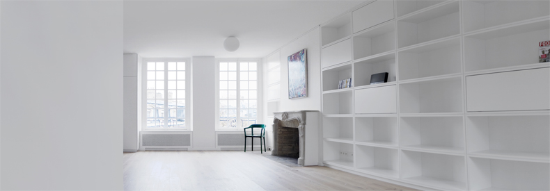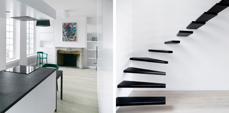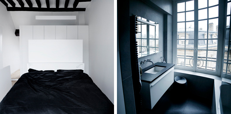 This 95 square meter flat is designed by French architecture and design studio, Ecole. It’s facing the Eglise Saint-Gervais on one side and the Hôtel de Ville de Paris on the other. The whole of the the two top floors of an 18th century building are occupied by it. Of course the flat is a restoration of the existing space to become suitable for a contemporary lifestyle. The first floor become a large open space where the entrance, the living room and the kitchen form one single continuity. The guest space that consists of a bedroom and a bathroom is also located on that floor. An amazing steel staircase links the living room to the owner’s private space underneath the roof. Even though the flat features a black and white minimalist decor there is a touch of oldness thanks to a georgeous fireplace and natural wooden floors.