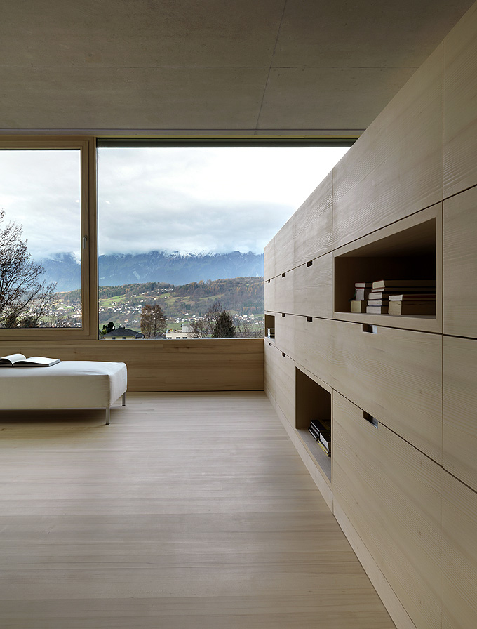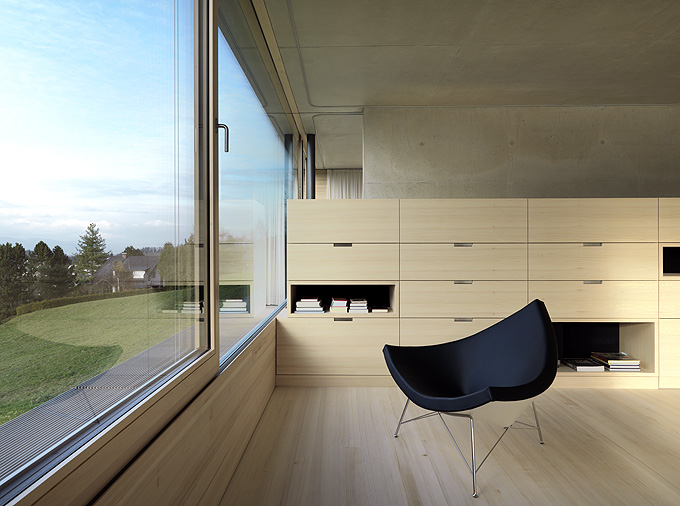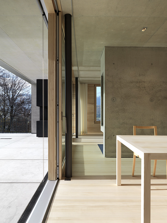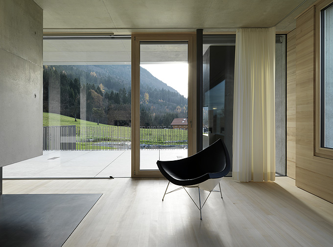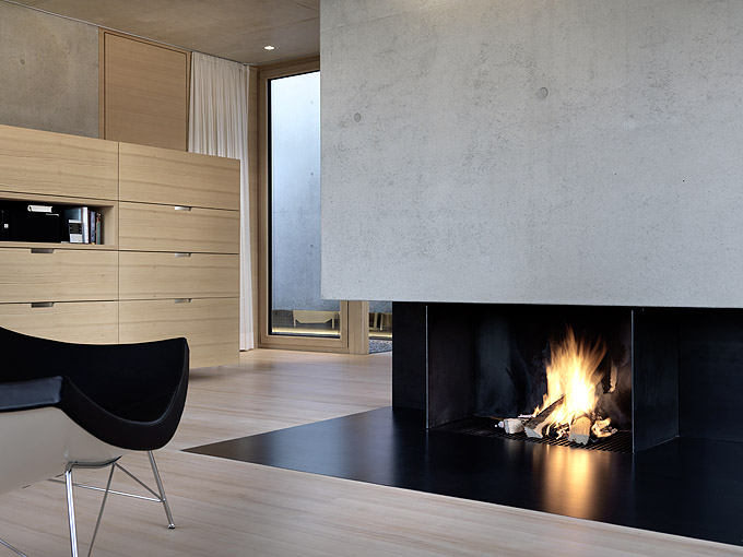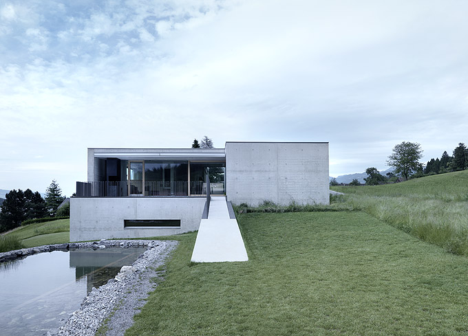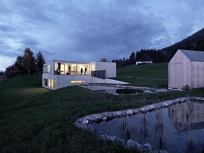 It’s always interesting to see how architects manage to create a truly minimalist and modern houses that are still very comfortable and livable. Germann House by marte.marte Architekten is one of such houses. It looks like monolithic structure made of concrete but it’s more than that. It features a cool terrace and the extensive glazing which reveal the scenery and mountain panorama. Beisdes, the terrace faces the pond and small integrated stream, which blend in with their natural surroundings. The smooth exposed concrete surfaces find their counterpart in the interior in the tactile and optical softness of the white pine floors, built-in furniture and walls. Windows and doors are done in white aluminium that bring a touch of modernism and style to the interior.