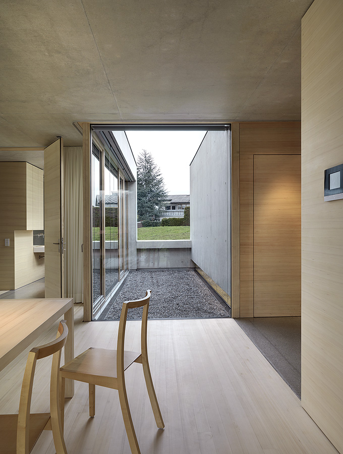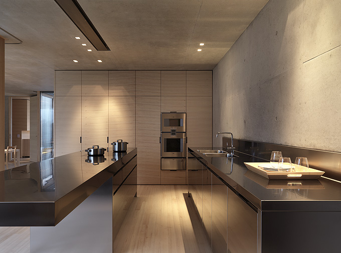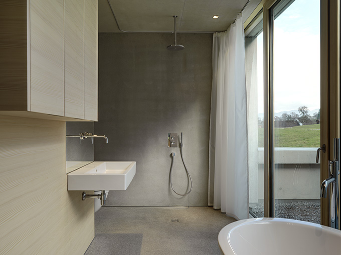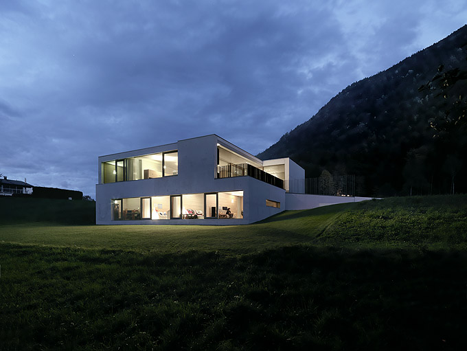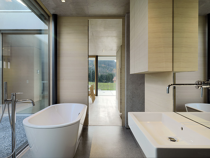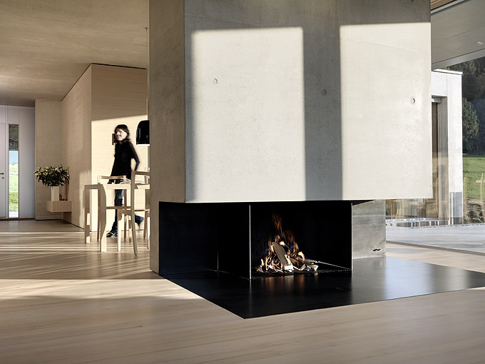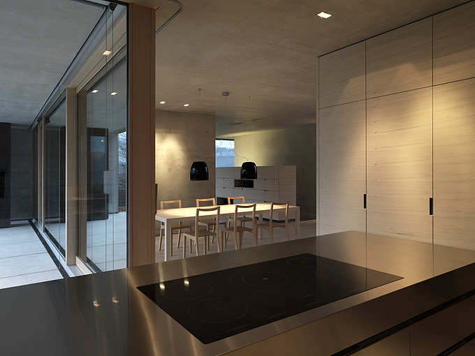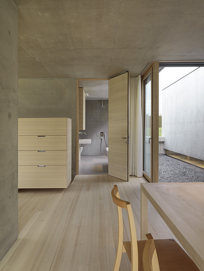 It’s always interesting to see how architects manage to create a truly minimalist and modern houses that are still very comfortable and livable. Germann House by marte.marte Architekten is one of such houses. It looks like monolithic structure made of concrete but it’s more than that. It features a cool terrace and the extensive glazing which reveal the scenery and mountain panorama. Beisdes, the terrace faces the pond and small integrated stream, which blend in with their natural surroundings. The smooth exposed concrete surfaces find their counterpart in the interior in the tactile and optical softness of the white pine floors, built-in furniture and walls. Windows and doors are done in white aluminium that bring a touch of modernism and style to the interior.